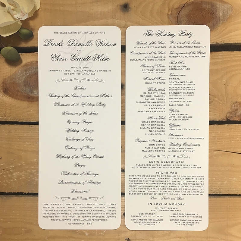 34 Wedding Programs Brooke W Program Slim Formal Panel Program back to gallery Related Items Brooke W Invitation Brooke W Program Brooke W Save the Date Brooke W Invitation Brooke W Signage Brooke W Napkin Brooke W Invitation Rehearsal Dinner Invitation back to gallery